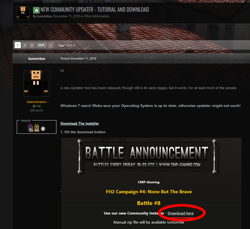 work in progress - SchwarzeNuss Detailed English instructions for installing the Community Map Pack (CMP) Current status 19.01.2020 These instructions assume that you have already completely installed FH 2. Short explanation Community Map Pack (CMP) - Updater CMP is a mappackage created by the FH 2 community, which also includes a small mod. An update program was developed to simplify installation and updating. Without the CMP it is not possible to play on the community maps or participate in the campaigns organized by the CMP community. It is not required to play the official FH 2 maps. CMP page: https://cmp-gaming.com/ Additional knowledge or programs Unzip - file archiving program To unzip you need a file archiving utility. I personally use Pea-ZIP, but you can also use any other archiving program (e.g. WinRAR, WinZIP) Download: https://www.peazip.org/ English explanation https://www.peazip.org/peazip-help-faq.html Install an archiving program of your choice. 1. Download Download the CMP Updater. You can find the CMP Updater on the following forum page: Here is the direct download link: https://s3.cmp-gaming.com/files/fh2-community-updater.zip 2. Unzip CMP As soon as the download is complete, you will have an archive file (fh2-community-updater.zip). Unzip them in a location of your choice. Note: So that the file does not disappear over time, I recommend storing it in the Forgotten Hope 2 main folder. There will always be CMP updates for which the CMP Updater is required. 3. Install CMP Please note: The installation is in English only! 3.1 Start of installation Start the existing setup file. You will now be informed that the program will begin with the installation. Confirm. 3.2 Selection of components CMP needs different components to work. If you want to be part of everything CMP has to offer, I recommend marking everything. FH2 CMP Mod – A small additional mod that is mandatory CMP Tournament Map – Maps for the regular campaigns CMP Public Maps – CMP maps for the public server Confirm. 3.3 Select folder Now you should specify the path to the official Battlefield 2 main folder in which the additional content of CMP should be installed. If you have a complete BF 2 (version 1.50) installation with FH 2, you can do this without hesitation (… EA Games / Battlefield 2). BUT If you have installed FH 2 standalone, this is not possible. You then choose the Forgotten Hope 2 main folder instead (… / Forgotten Hope 2). Confirm. 3.4 Installation / download of the components Downloading the necessary files will now begin. This can take a long time depending on your internet connection. You will be informed as soon as the installation is complete. Confirm. 3.5 Success You have now installed CMP. If you have installed FH 2, the FH 2 Launcher and CMP, you can now enjoy the complete FH 2 package. You should also note the following: User accounts As already mentioned in the instructions for installing the FH 2 Launcher under point 2.3, you need a user account in order to be able to use single player or multiplayer mode. If you already have a multiplayer account, you can use your old data to log in again. If you do not have a multiplayer account yet or would like to learn how to create a single player account, I will show you how to do it here: * Instructions and link follows *
