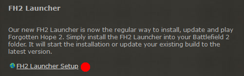 work in progress - SchawrzeNuss Detailed English instructions for installing the Forgotten Hope 2 Launcher Current status: 19.01.2020 These instructions assume that you have already created the basis for installing the FH 2 start program. For this you need about BF 2 in the latest version 1.50 or FH 2 standalone. Short explanation Official Forgotten Hope 2 Launcher For a while now, the official Forgotten Hope 2 Launcher has been required as a standard launch program for FH 2. Without this additional launcher, it is not possible to play on the servers. The FH 2 Launcher offers the following advantages, among others: - The automatic or manual update and repair option of your FH 2 installation - Options for graphics and audio settings outside of FH 2 It has been provided by the official FH 2 team since 2016. 1. Download Download the FH 2 launcher. You can find it on the official FH 2 page under the "Downloads" section: http://forgottenhope.warumdarum.de/fh2_downloads.php? Here is the direct download link: http://forgottenhope.warumdarum.de/download/FH2Launcher-Setup.exe 2. Install FH 2 Launcher After you have downloaded it, you now have the installation file for the FH 2 Launcher (FH2Launcher-Setup.exe). Note: The installation is in English only! 2.1 Start the installation When you start the installation application, you will be faced with the license agreements. If you are interested, you can read them. Confirm. 2.2 Specify folder Now you should specify the path to the official Battlefield 2 main folder in which the FH 2 Launcher should be installed. If you have BF 2 (version 1.50), you can do this without hesitation (… EA Games / Battlefield 2). BUT If you have installed FH 2 standalone, this is not possible. You then choose the Forgotten Hope 2 main folder instead (… / Forgotten Hope 2). Confirm. 2.3 Start now? After the installation is complete, you will be asked if you want to start FH 2 now. If you want to continue with the installation of the optional Community Map Pack (CMP for short, a map package created by the community, more on this later) after this installation, you should remove the check here. If you are currently not interested in CMP, you can of course set the marker and start FH 2 immediately. (Note: In order to play FH 2, you need an account, more on this later) Confirm. 2.4 Desktop icon The installation program now creates a beautiful FH 2 icon for you on your desktop. You can start FH 2 at any time in the future using this desktop icon 2.5 Success You have now installed the mandatory components to play FH 2. CMP Are you interested in the optional CMP content extension? Then I'll show you how to install it here: User accounts Regardless of whether you decide to start playing right away, or whether you prefer to install CMP first, either way you should consider the following: As already mentioned in point 2.3, you need a user account in order to be able to use single player or multiplayer mode. If you already have a multiplayer account, you can use your old data to log in again. If you do not have a multiplayer account yet or would like to learn how to create a single player account, I will show you how to do it here: * Instructions and link follows *