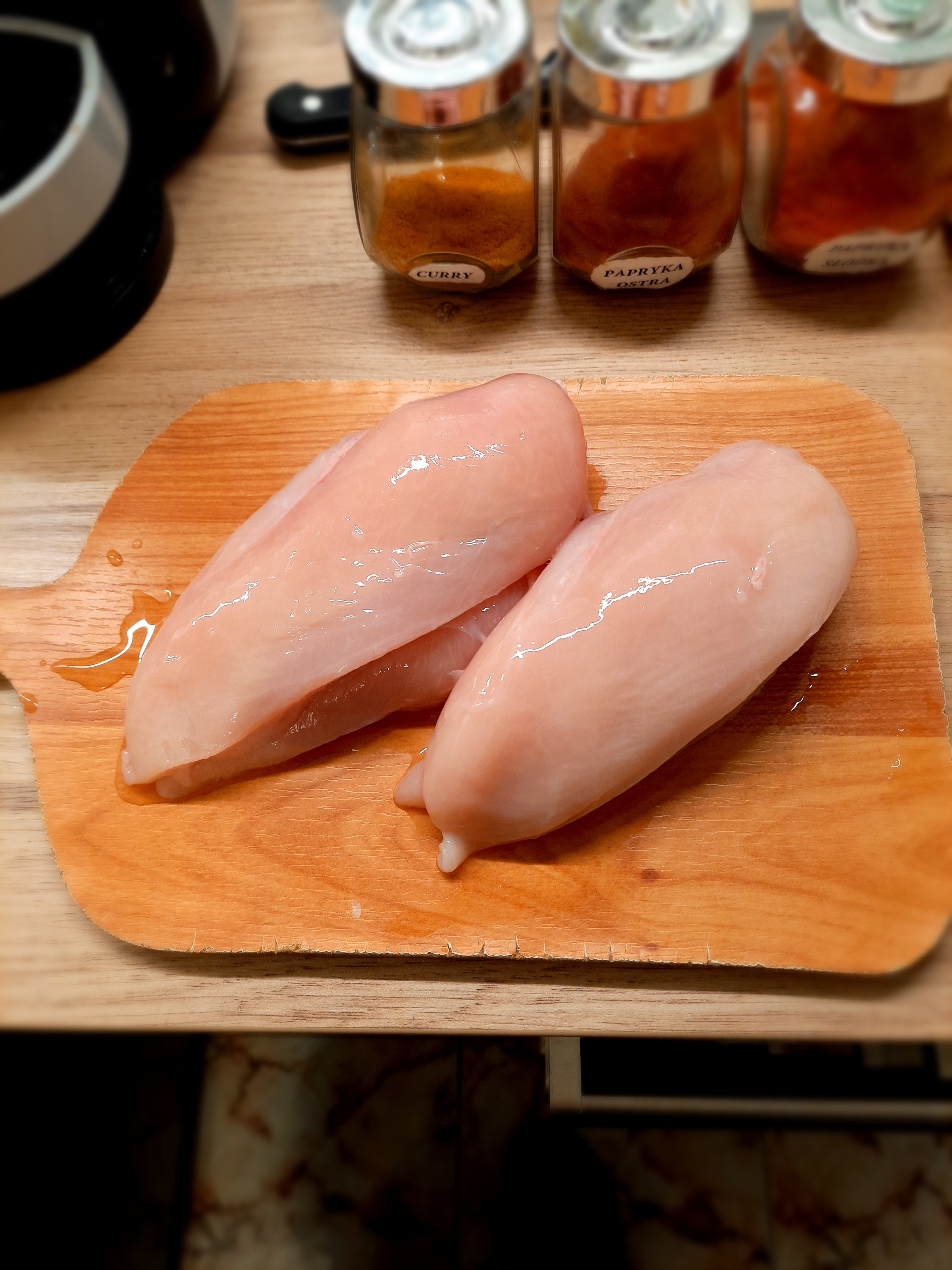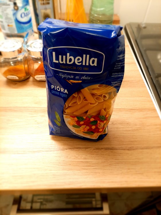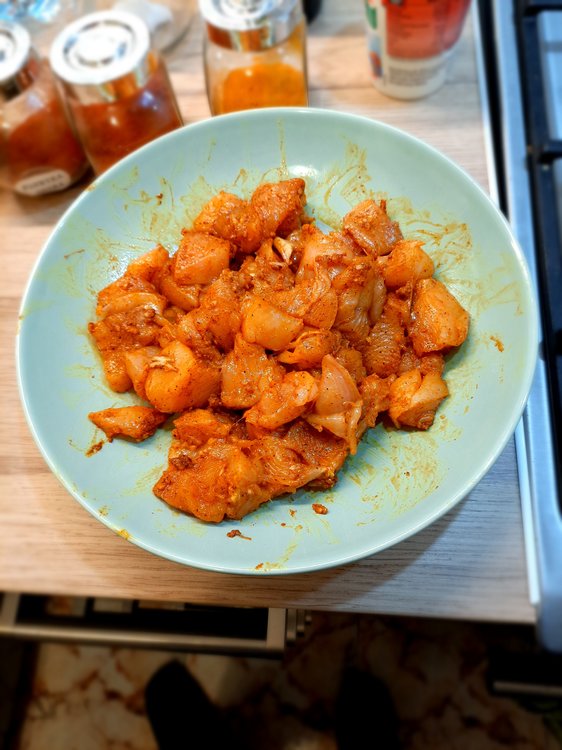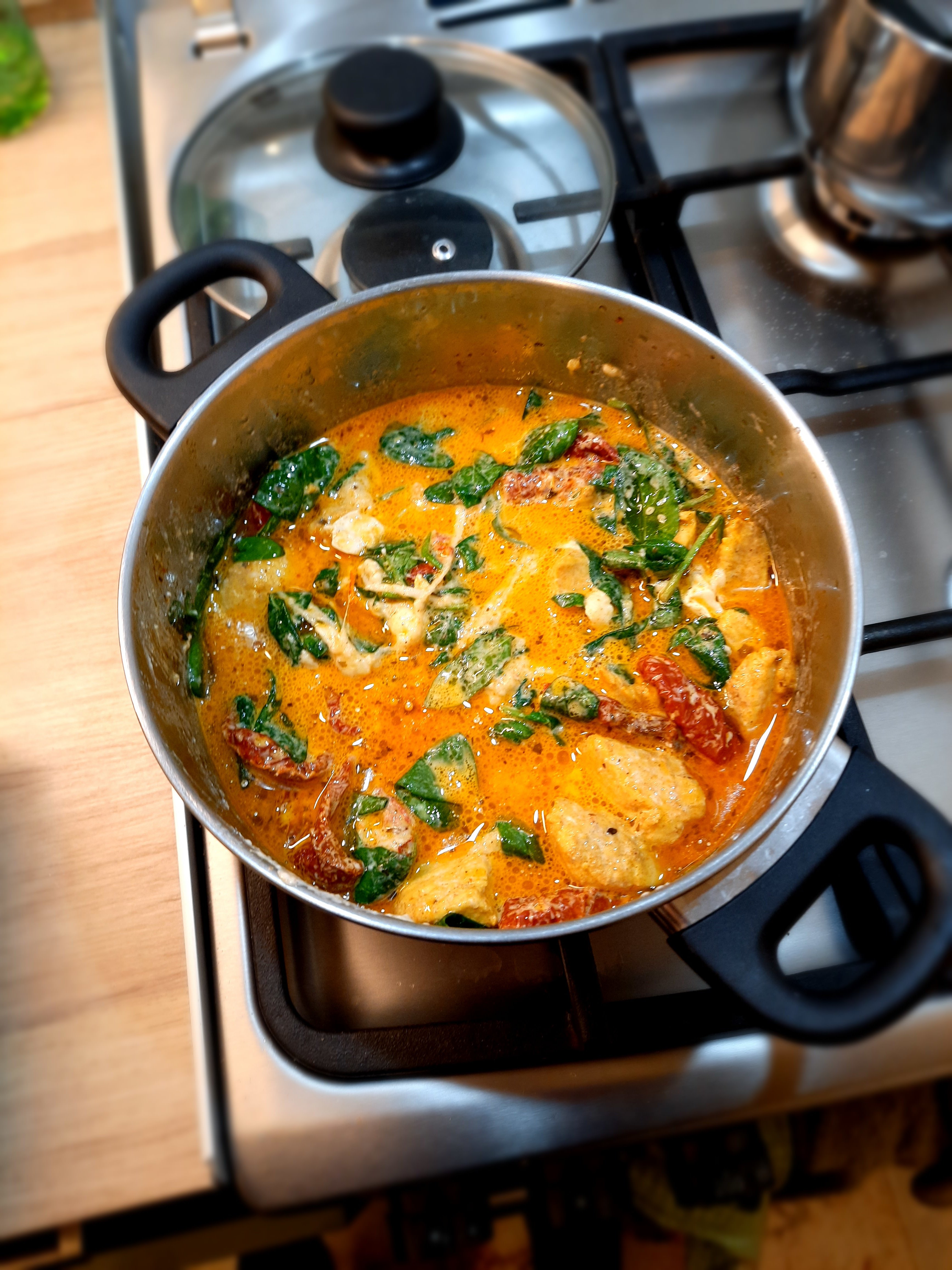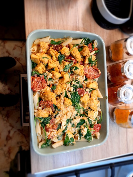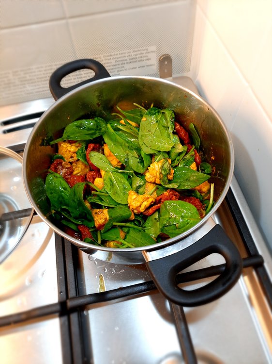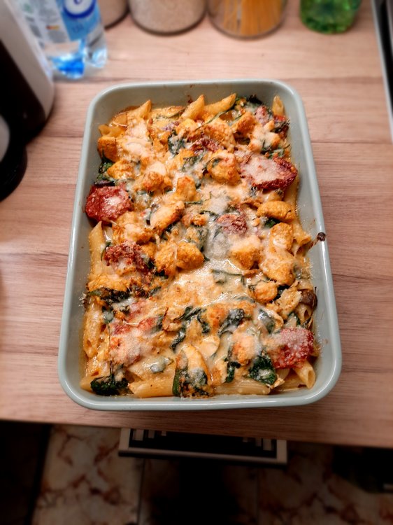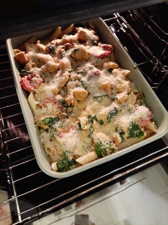 Penne gratin with chicken, spinach and dried pomatoes Main ingredients: 2 chicken breasts: Dried tomatoes: Spinach: Penne: Chicken marinade: Olive oil: 2 cloves of garlic: Spices: -curry (1 teaspoon) - hot pepper (1/2 teaspoon) - sweet pepper (1 teaspoon) -turmeric (1 teaspoon) -salt (1/2 teaspoon) -pepper (1 teaspoon) "Filling": -Mozarella -Camembert -cream 30% - nutmeg 1 teaspoon (only if you would like) Additional ingredients: -grated Grana Padano 1. Cook penne 2, In the meantime, prepare chicken and its marinade - wash chicken, clean it out of white membranes and cut it into pieces. Mix spices with olive oiles and garlic: And mix it with chicken by your hands: When your penne is ready, immediately drain it off and wash it under cold water. In the same pot (however maybe pan would be better), put a spoon of olive oil and fry the chicken shortly. After that, turn off the gas jet and mix the chicken with spinach and dry tomatoes in the pot. And here is your choice if you want to add this oil from dry tomatoes in or not, maybe it would be better to leave it for salad? Now time for "the filling sauce" and at this point you can launch your oven at 200 C - cut camembert and mozarella into pieces and put into saucepan with 30% cream and add 1 teaspoon of nutmeg (if you want); heat it and melt it: Then mix the sauce with chicken in the pot. Put Penne into gratin dish greased with butter, and pour the chicken on it: Drop greased Grana Padano on it and put it into oven for 15 min: In the meantime you can clean your pile of dishes When your meal is ready you can put greased Grana Padano on it too: Bon appetit!