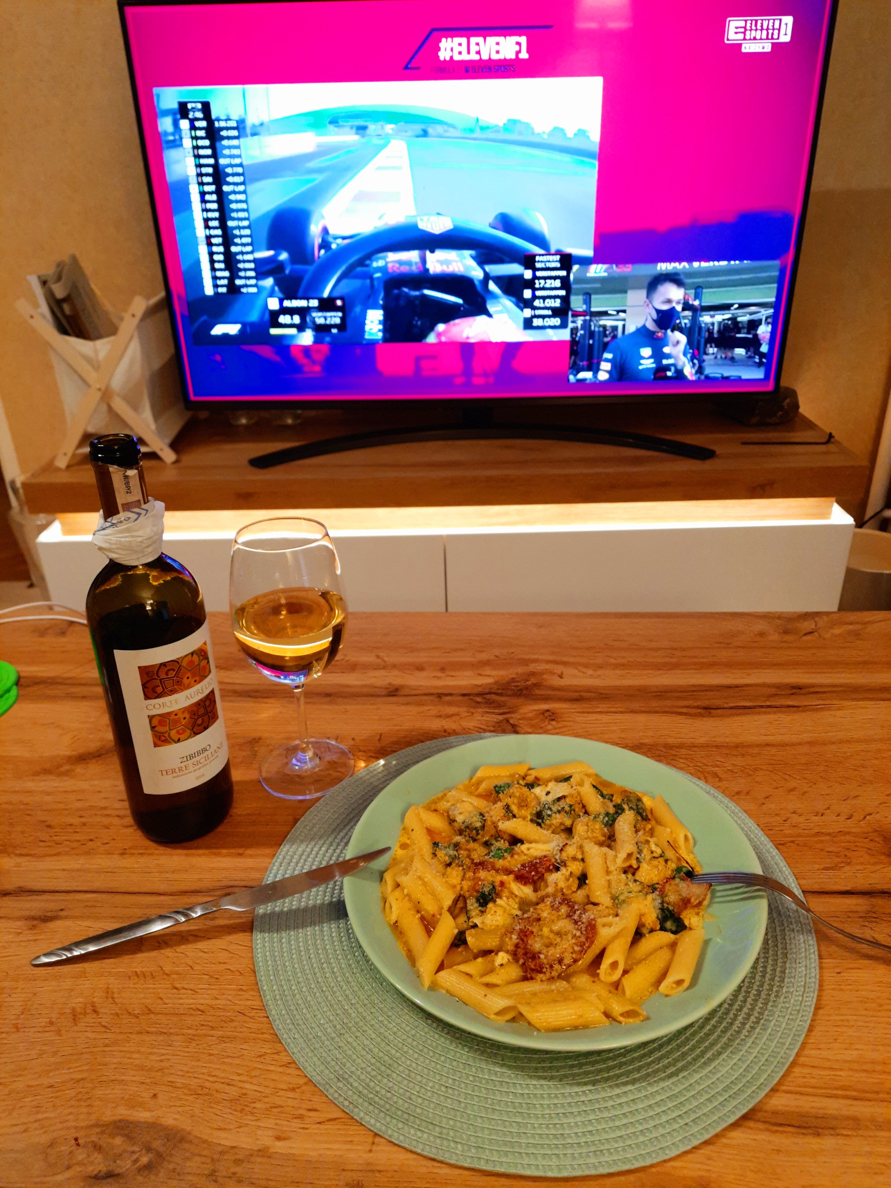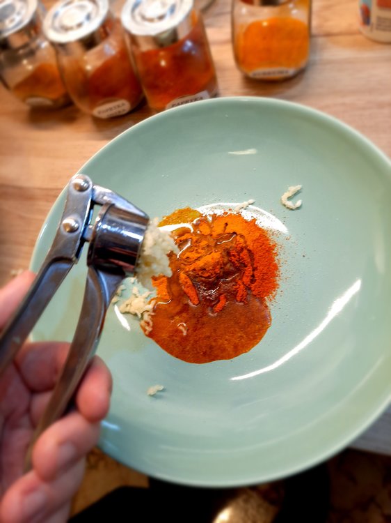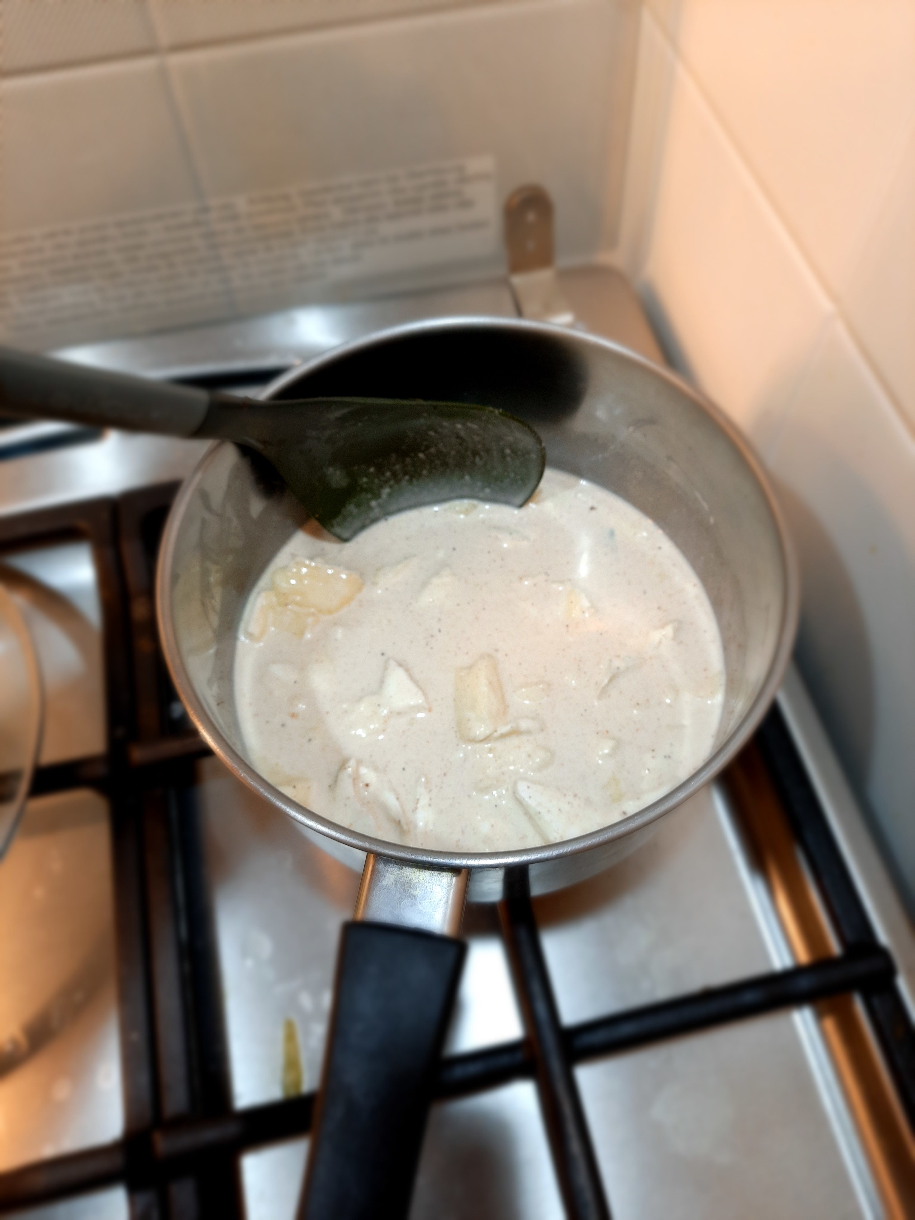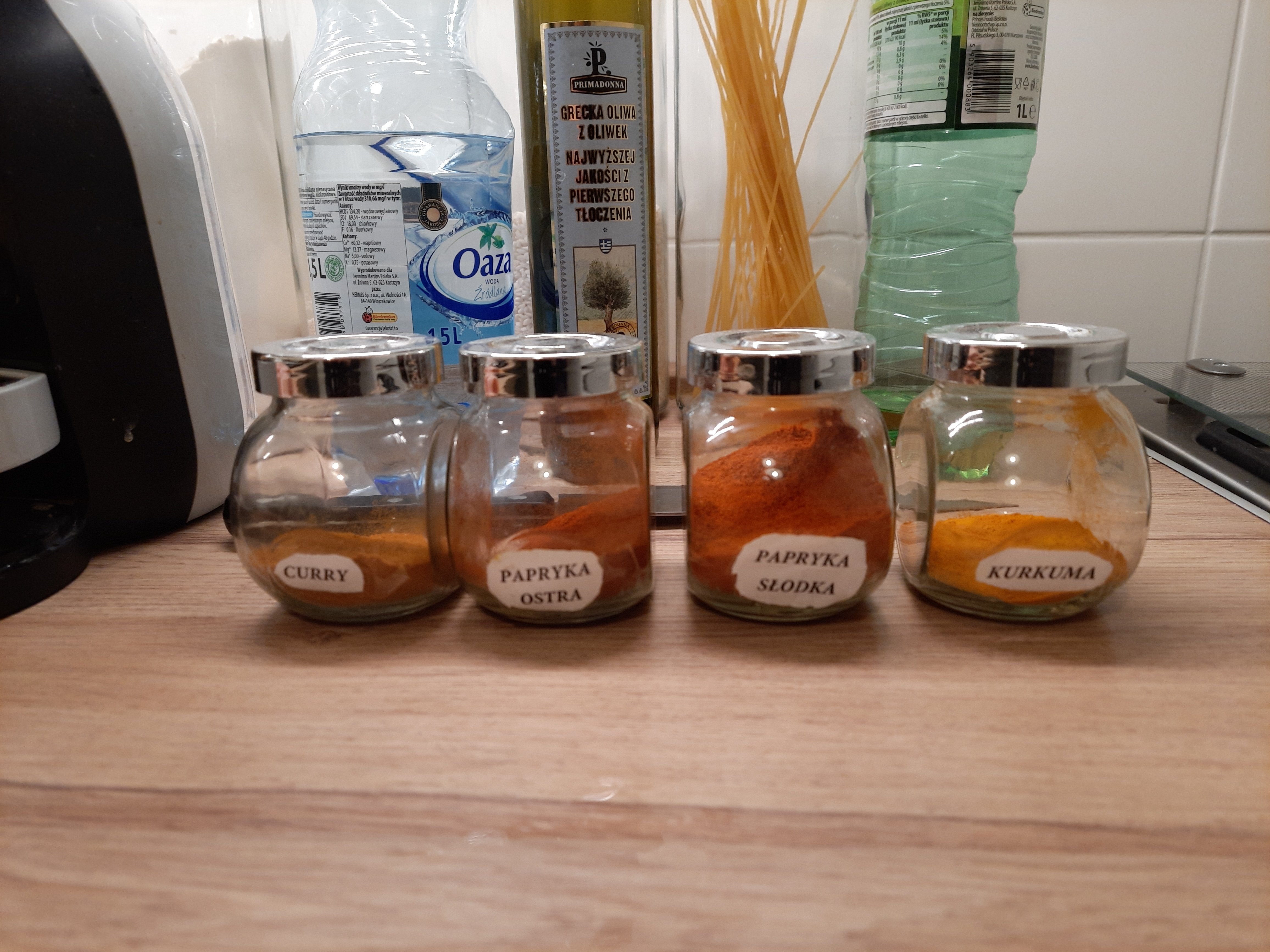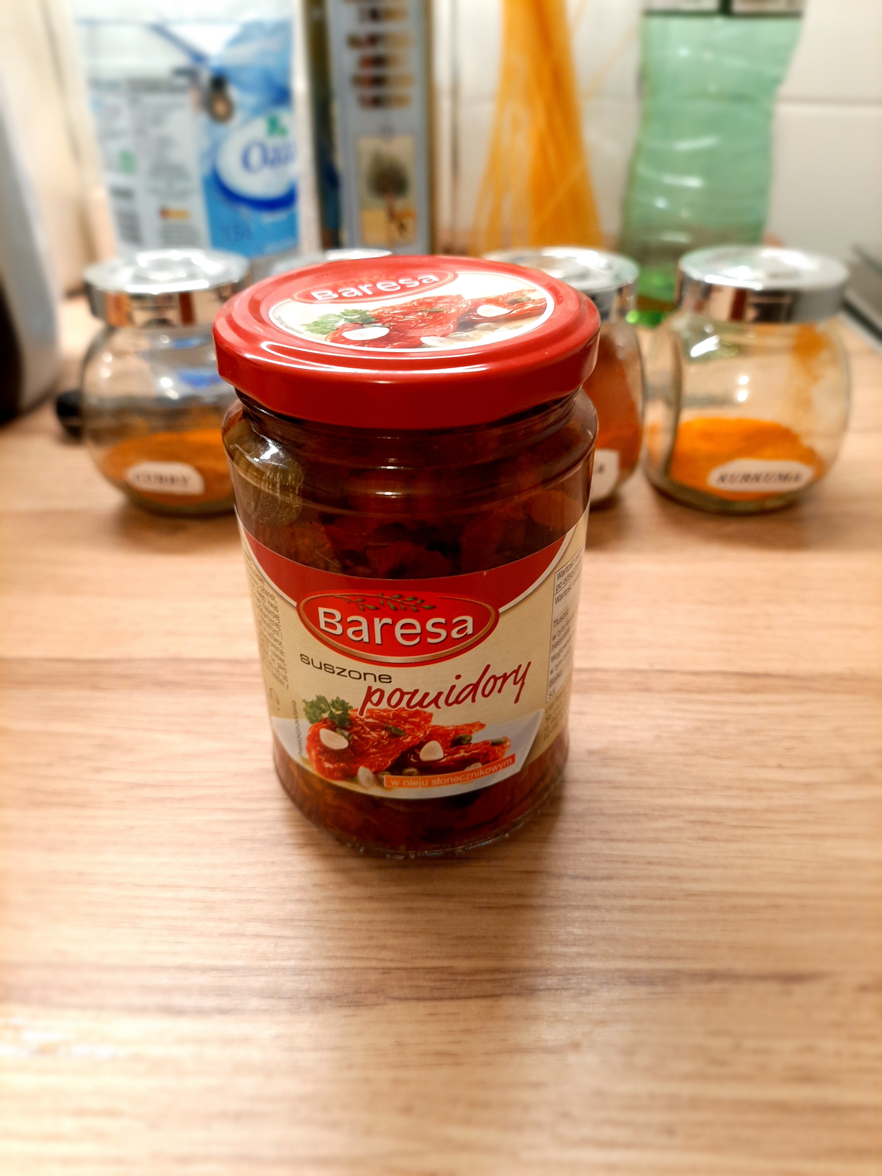 Penne gratin with chicken, spinach and dried pomatoes Main ingredients: 2 chicken breasts: Dried tomatoes: Spinach: Penne: Chicken marinade: Olive oil: 2 cloves of garlic: Spices: -curry (1 teaspoon) - hot pepper (1/2 teaspoon) - sweet pepper (1 teaspoon) -turmeric (1 teaspoon) -salt (1/2 teaspoon) -pepper (1 teaspoon) "Filling": -Mozarella -Camembert -cream 30% - nutmeg 1 teaspoon (only if you would like) Additional ingredients: -grated Grana Padano 1. Cook penne 2, In the meantime, prepare chicken and its marinade - wash chicken, clean it out of white membranes and cut it into pieces. Mix spices with olive oiles and garlic: And mix it with chicken by your hands: When your penne is ready, immediately drain it off and wash it under cold water. In the same pot (however maybe pan would be better), put a spoon of olive oil and fry the chicken shortly. After that, turn off the gas jet and mix the chicken with spinach and dry tomatoes in the pot. And here is your choice if you want to add this oil from dry tomatoes in or not, maybe it would be better to leave it for salad? Now time for "the filling sauce" and at this point you can launch your oven at 200 C - cut camembert and mozarella into pieces and put into saucepan with 30% cream and add 1 teaspoon of nutmeg (if you want); heat it and melt it: Then mix the sauce with chicken in the pot. Put Penne into gratin dish greased with butter, and pour the chicken on it: Drop greased Grana Padano on it and put it into oven for 15 min: In the meantime you can clean your pile of dishes When your meal is ready you can put greased Grana Padano on it too: Bon appetit!