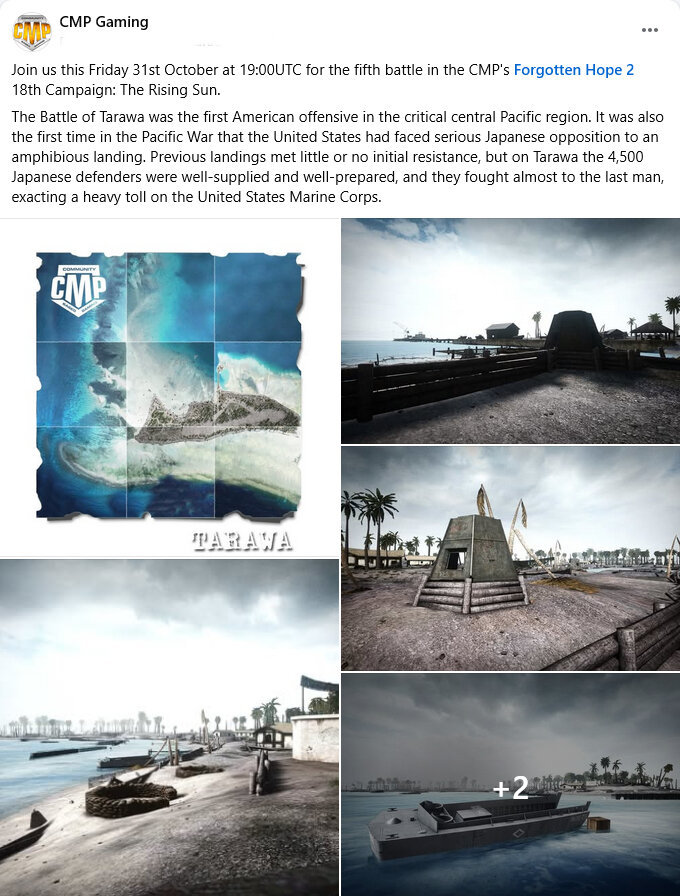 untilCMP FH2 Campaign #18: The Rising Sun Battle #5: Tarawa History "In order to set up forward air bases capable of supporting operations across the mid-Pacific, the U.S. planned to take the Gilbert Islands. The American invasion force to the Gilberts was the largest yet assembled for a single operation in the Pacific, and the Battle of Tarawa was the first American offensive in the critical central Pacific region. It was also the first time in the Pacific War that the United States had faced serious Japanese opposition to an amphibious landing. The uniform worn by the soldiers on Tarawa was the then brand-new initial production version of the reversible 1942 pattern camouflage utilities. The uniform was reversible, with a dominantly green and brown “jungle” printed camouflage pattern on one side, and a dominantly brown and tan “beachhead” pattern on the other. The helmet camouflage cover was issued in a similar reversible pattern. At this point in the war, the Marines were gradually being issued with the new standard caliber .30 M1 rifle, the iconic "Garand." However, many Marines still retained the Springfield bolt action as they landed on the beaches. " The Battle for Tarawa was a battle in the Pacific. The battle took place on the Tarawa Atoll in the Gilbert Islands. Nearly 6.400 Japanese and Americans died in the fighting, mostly on and around the small island of Betio, in the extreme southwest of Tarawa Atoll. The Battle of Tarawa was the first American Offensive in the critical central Pacific region. It was also the first time in the war that the United States faced serious Japanese opposition to an amphibious landing. It was boasted by its defenders that a million Americans couldn't take Tarawa in 100 years. The next 76 hours was to be the crucible for such a struggle