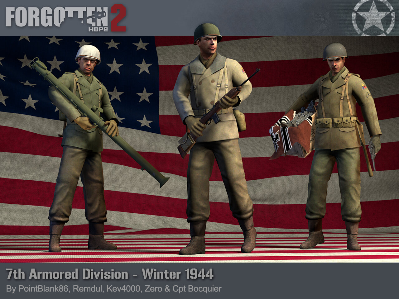 The Road to Forgotten Hope 2.66 Red Christmas - Part 3 Posted by: Guarnere & CptBocquier 12.06.2025 18:00 GMT Hello and welcome back to another Forgotten Hope 2 update. Today we are showcasing some elements that were recently updated : the US Army playermodels during the Fall and Winter of 1944. With the release of the 2.4, Forgotten Hope 2 introduced the intense fights of the Hurtgen Forest and the Battle of the Bulge. While the German soldiers in late 1944 were featured in some news, we never took the case to actually showcase the changes that occured on the uniforms of the American soldiers. As depicted in the fields of Normandy ingame, the various units from the US Army operating in Europe used a variety of clothing like the cotton M1941 Field Jacket, the cotton twill M1942 Paratrooper uniform or in some rare case the Herringbone twill (HBT) utility uniform. While most of the soldiers used basic tanned leather shoes with heavy canvas leggings, the paratroopers dropped with distinct jump boots. Many criticism depicted these uniforms as inadequate, like the Olive Drab (OD) n°3 shade of the M1941 Field Jacket that gave poor concealment in the European theater or the lack of large pockets. Another example was the paratrooper trousers that were prone to tore around the knees or the crotch. A new design was pushed by the Army consisting of a standardized M1943 field jacket issued in Olive Drab (OD) n°7, with two large breast pockets and two skirt pockets. No big changes were made on the trousers but various buttons and a looser fit. To remplace the boots and gaiters for all units the M1943 Combat Service Boots was introduced, including a leather cuff that can be quickly fastened with a pair of buckles. While the first tests of the new M1943 uniform occured in Italy in 1943, the logistical situation prevented the use of the new design during the Normandy landings. Paratroopers received their M1943 uniforms just after D-Day engagments, while the rest of the US Army in Europe slowly got issued, making it more widespread in Late 1944. Ingame, the paratroopers from the 101st Airborne fighting in Bastogne are all wearing the M1943 uniforms, even if a lot of troopers kept elements of their M1942 uniforms, notably their jumping boots that were less subject to getting caught in a parachute. GIs fighting in the Hurtgen Forest receive a mix of M1943 uniform and older elements, same for Rangers supporting them. Finally the various units caught in the German Offensive through the Bulge wear a majority of M1943 uniforms, even if some soldiers also use the M1938 Overcoat Mackinaw. Small details like mittens, gloves or scarfs have been repartited through all playermodels depending on the season. While the webbings and gear elements are unchanged, the gear repartition has been remade to underline the task differences carried by each type of unit (Paratroopers, Rangers or simple soldiers). Some helmets and vests also received their divisional emblem or recognition markings, following the pride carried by the soldiers to be a part of a unit or the essential need to quickly recognize a soldier's assignement. The base Winter American playermodels were done by PointBlank86, Remdul, Kev4000, with the faces done by Zero and were reworked by Cpt Bocquier. If you have missed any previous updates this week, you can find links to them here: Go to Road to Forgotten Hope 2.66 Red Christmas - Part 1 Go to Road to Forgotten Hope 2.66 Red Christmas - Part 2