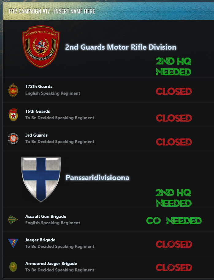 A new FH2 campaign will be starting very soon! We need players to volunteer for some leading roles. If there are no volunteers to lead the teams, regiments or squads then the campaign will NOT go ahead! The needed positions are below: Allied/Axis 2nd HQ English Speaking CO If you're interested in any of the spots above please let us know. Without HQ and other leaders, the campaign will be delayed until people volunteer! Keep in mind that you won't be left on your own. You'll be supported by other players and the admin team. All the help needed will be given. POST BELOW if you're interested in any of the roles (HQ / CO / SL), or send a PM to @Sir_Kowskoskey, @RAnDOOm or @Hawk