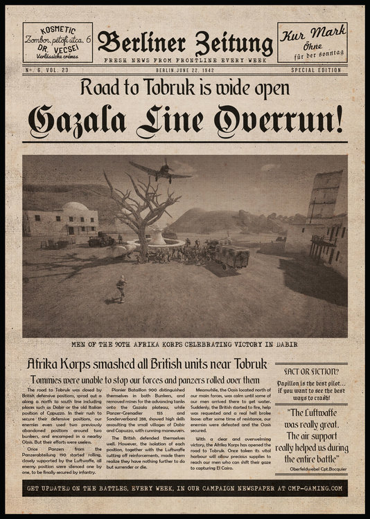 News from battlefront!!! Germany defeated the British in Gazala!!! Read our Newspaper today thanks to our War journalists @Wualy and @Quicksilver (click on the newspaper, then click on the magnifying glass to read a larger version)