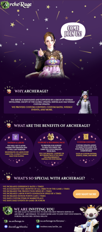 1. Hello everyone, since the official servers of ArcheAge for EU and NA are unfortunately no longer online, there is only the possibility to play on private servers. Fortunately, there is one that has been active for several years and is being developed internally. Update 9.0 was recently released here with various custom changes, as a result of which the server has recently seen a strong influx of players. There are now also very good opportunities for new players to join the active players. So if you are still interested in Archeage, be sure to check it out again. Further information can be found in the picture.