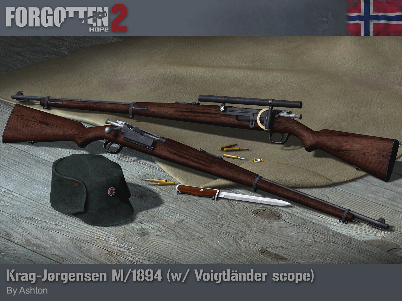 RAnDOOm Posted June 15, 2022 Posted June 15, 2022 Hello and welcome back to another Forgotten Hope 2 update. It has now been just over a month since we released 2.6, and we feel that it is time to give an update on what we are planning to next. While we waited for the last bits to be polished up for the last update, some of us had already moved on to other projects, and it is this work that has driven our direction in the immediate future. There are already several maps in development that are in a good state along the road to completion, and we have given you a brief teaser of them here: Please bear in mind that these are all work in progress, but we think you'll have a bit of guessing to do from the clues provided! Some of these maps are taking our French faction to other times and places beyond May 1940, while the others are focusing on two of the other factions fighting at the conclusion of the Phoney War: Belgium and Norway. As a little taster for these upcoming factions we have the following render: In his role as director of the Kongsberg Arsenal, Ole Krag had already been involved with a number of weapon designs for magazine fed rifles, culminating in the tube fed black powder Krag-Petersson and Jarmann rifles. The latter of these was adopted in 1884, and with production just getting started was made obsolete overnight by the new French small bore smokeless powder cartridge. While Norway and Sweden would go back to the drawing board to agree on a new joint cartridge and rifle, Ole Krag would partner with Erik Jørgensen to develop a new capsule magazine, which when paired with a new action would be adopted by the Danish Army in 1889. Examples of this rifle would make their way into the joint trials, both as the original Danish design and as the updated 1892 model that was sold to the United States. Ultimately the trials would end with Sweden and Norway adopting the 6.5×55mm ammunition, but they would disagree on the rifle - Sweden preferring the m/94 Mauser while Norway would adopt the M/1894 Krag-Jørgensen. The most notable feature of the Krag-Jørgensen design is the half capsule magazine system, that is filled by opening a door on the side of the rifle and dumping in loose cartridges. The rifles were fitted with a magazine cut-off to allow single loading, but were never successfully adapted to a quick loading system in military use. The Model 1894 rifle would be produced until 1922, with 215000 being made at Kongsberg and a further 29000 at Steyr. In 1910, 1000 of these rifles were fitted with a 4x telescopic sight made by the company Voigtländer. This early attempt at a dedicated sniping rifle was not particularly successful. This did not stop the scoped rifles from being used in training leading up to 1940 - with some of them also seeing combat in the hands of Norwegian marksmen during the campaign. Our Krag-Jørgensen M/1894 was made by Ashton.