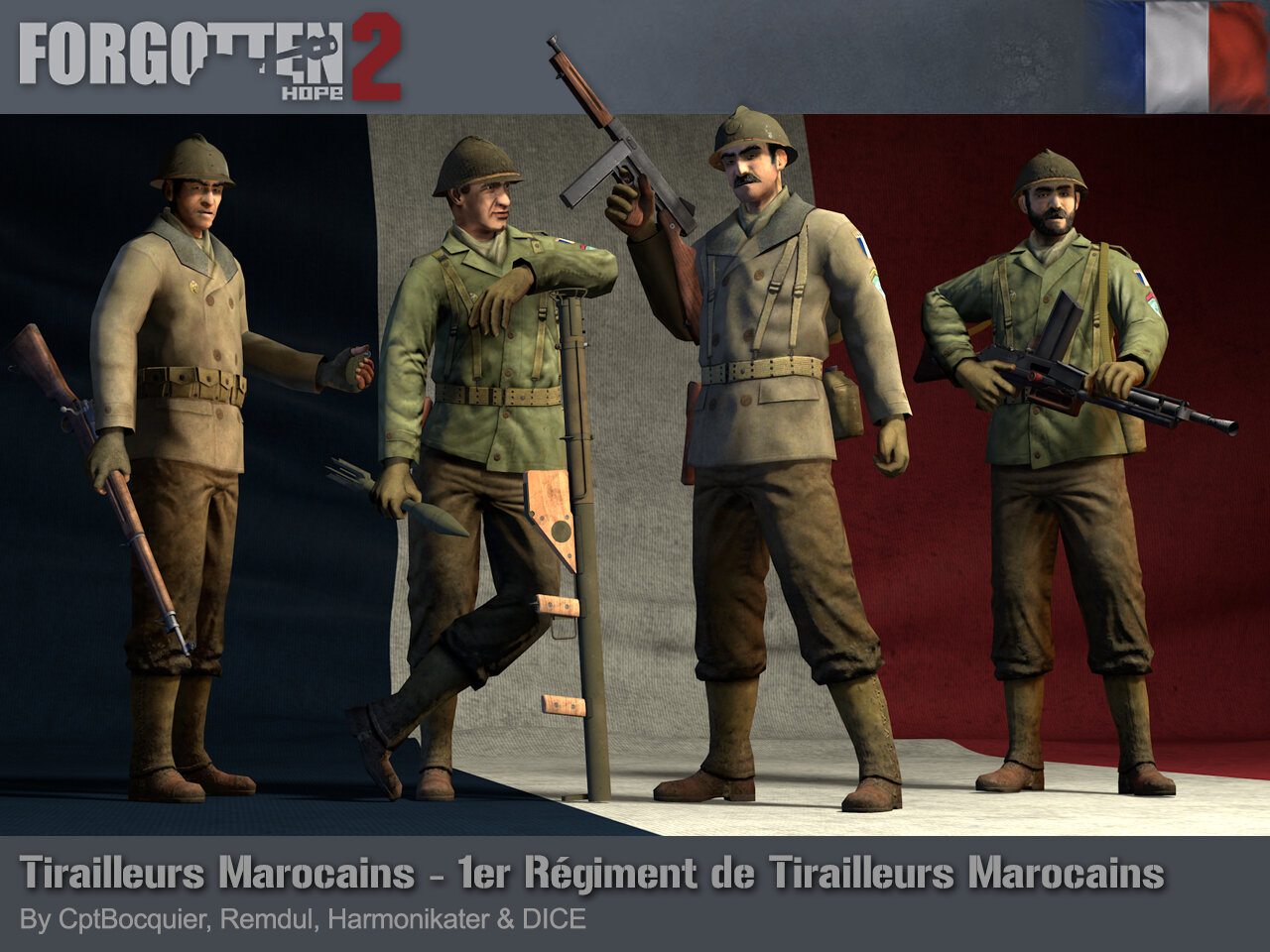 RAnDOOm Posted January 23, 2024 Author Posted January 23, 2024 The Road to Forgotten Hope 2.64 Compagnons - Part 7 Posted by: Cpt Bocquier and Eat Uranium 22.01.2024 21:00 GMT Hello and welcome back to another Forgotten Hope 2 update. Today we are nearly at the end of this set of Road to news, and as is typical we end on a summary of the new content coming in 2.64 Compagnons, but not before we get one last set of playermodels in. The Tirailleurs Marocains were formed from auxiliary troops that had been formed in 1912 after the establishment of the French protectorate of Morocco. Their regular infantry units composed between 70 to 75% Moroccan soldiers. The various regiments would acquire some fame for their actions in the First World War and would also take part in various operations in the interwar period: the occupation of Rhenania, the Rif War and peace operations in Syria and Lebanon. In 1940, 1er Régiment de Tirailleurs Marocains fought at Gembloux and was caught in the Lille pocket, helping delay German forces from destroying the Dunkirk pocket. Reconstituted in June 1940, it would be a part of the Armée d'Armistice and fought against the Allied intervention in Syria and resisted the Allied landings during Operation Torch at Port-Lyautey. After the rearmament of the French forces in North Africa by the Allies, it would liberate Corsica in September 1943, breakthrough the Gustav Line in Italy then would join the fight in Alsace in late 1944 before taking part in the encirclement of the Black Forest and the campaign for Austria in 1945. Our RTM playermodels were made by CptBocquier, from our US playermodels made by Remdul, with accessories by Harmonikater and heads by DICE. Finally today, we'd like to list some of the changes coming in Compagnons: 6 New playermodels and playermodel textures: French Colonial Soldiers 1942 Free French North African Soldiers 1942 Tirailleurs Marocains 1944 Zouaves 1944 Polish Forces in the West 1944 Tropical Fallschirmjägers 1942 2 New maps: La Hardt Forest Medjez el Bab 10 New weapons, including: Beretta 38/42 MG 34/41 RG-42 Grenade Coupe-Coupe M1921 Thompson 5 New vehicles: M4A2 Sherman Panzer I Ausf.B Panzerjäger I 7.5 cm PaK 97/38 7.5 cm FK 231(f) Reworked weapons and vehicles, including: G41(W) revised bakelite handguard and bayonet M1 Garand ironsight adjustment knob reworked to correct wartime version M9 Bazooka added the shoulder rest New Finnish textures for the 122/H38 and 45 PstK/37 Many further changes, including: New high quality reticules for vehicles, snipers and binoculars Adjustable sniper scope ranging Leaning New first and third person animations for several handweapons Various code fixes and updates to solved problems and crashes A more comprehensive list of changes can be seen in the Compagnons 2.64 Changelog. If you have missed any previous updates this week, you can find links to them here: Go to Road to Forgotten Hope 2.64 Compagnons - Part 1 Go to Road to Forgotten Hope 2.64 Compagnons - Part 2 Go to Road to Forgotten Hope 2.64 Compagnons - Part 3 Go to Road to Forgotten Hope 2.64 Compagnons - Part 4 Go to Road to Forgotten Hope 2.64 Compagnons - Part 5 Go to Road to Forgotten Hope 2.64 Compagnons - Part 6 1